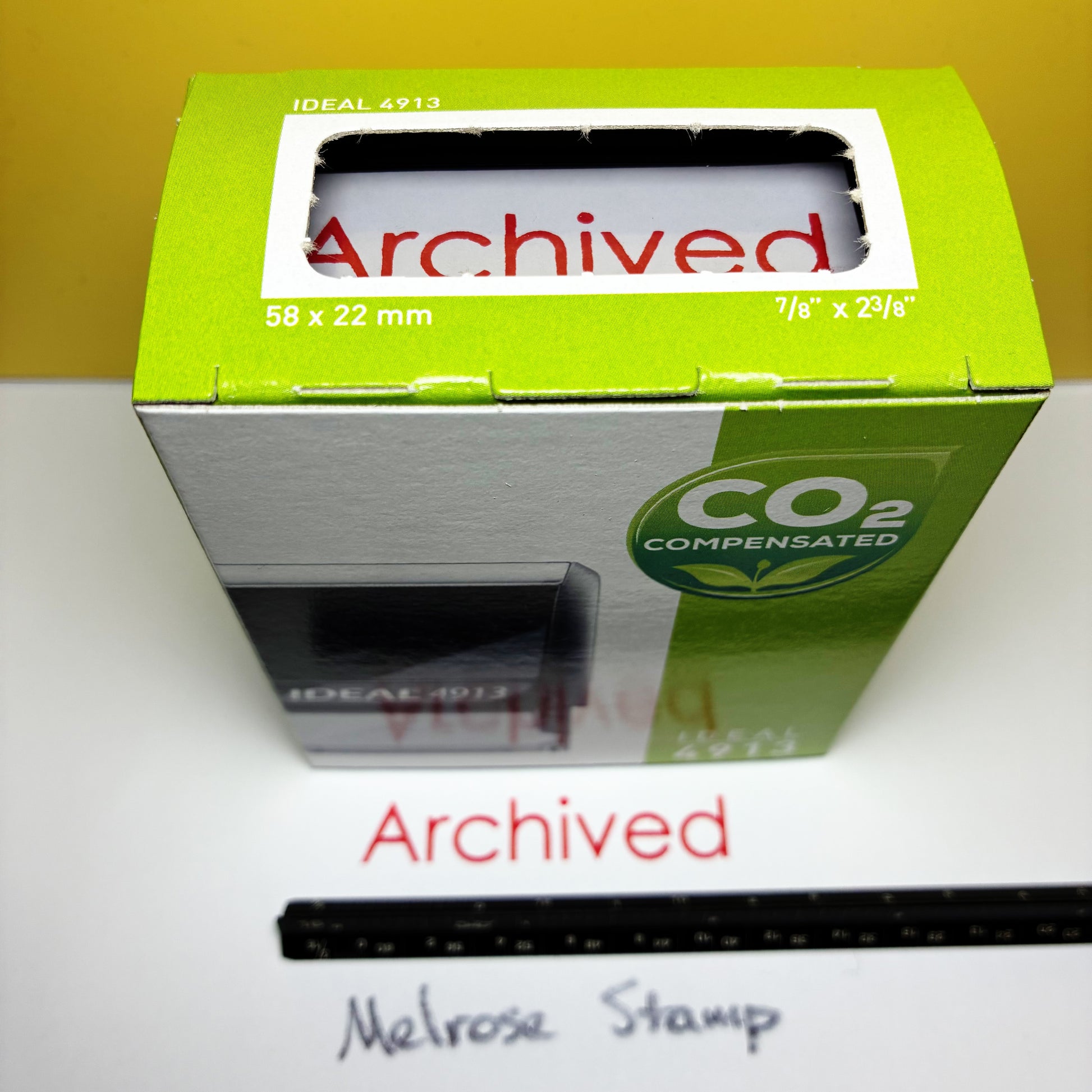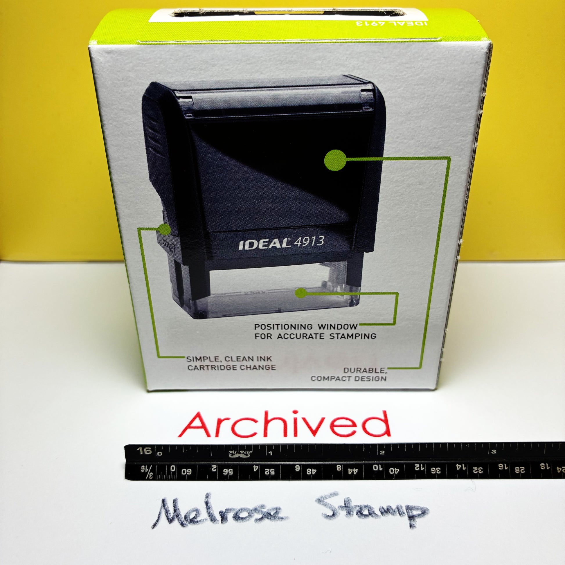 The Ideal 4913 Stamp Model has an Impression Area of: 2.38" length x .88" width/height (58 mm x 22 mm). Stamper can be re-inked for thousands of impressions. Don’t settle for smaller stamps!
