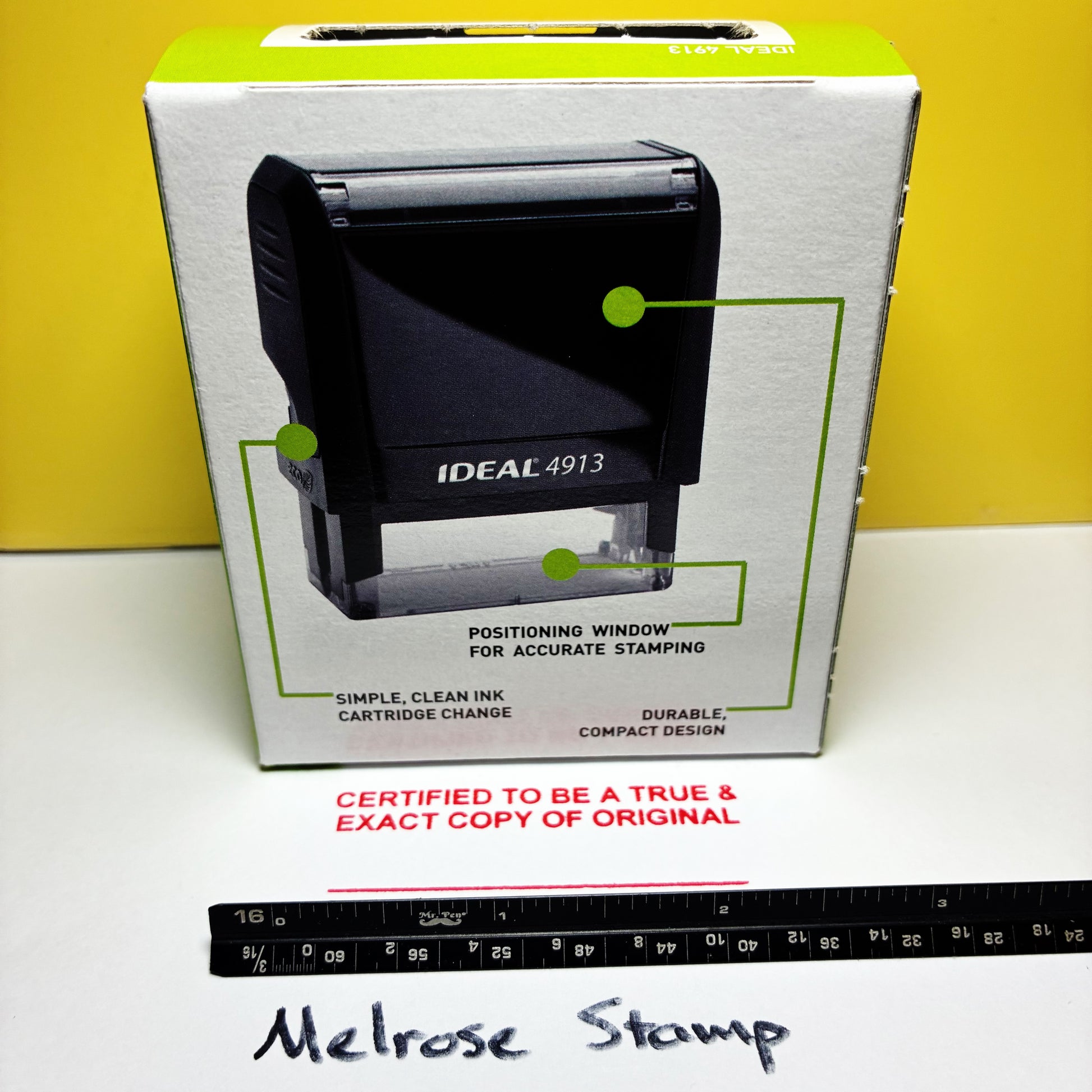 The Ideal 4913 Stamp Model has an Impression Area of: 2.38" length x .88" width/height (58 mm x 22 mm). Stamper can be re-inked for thousands of impressions. Don’t settle for smaller stamps!