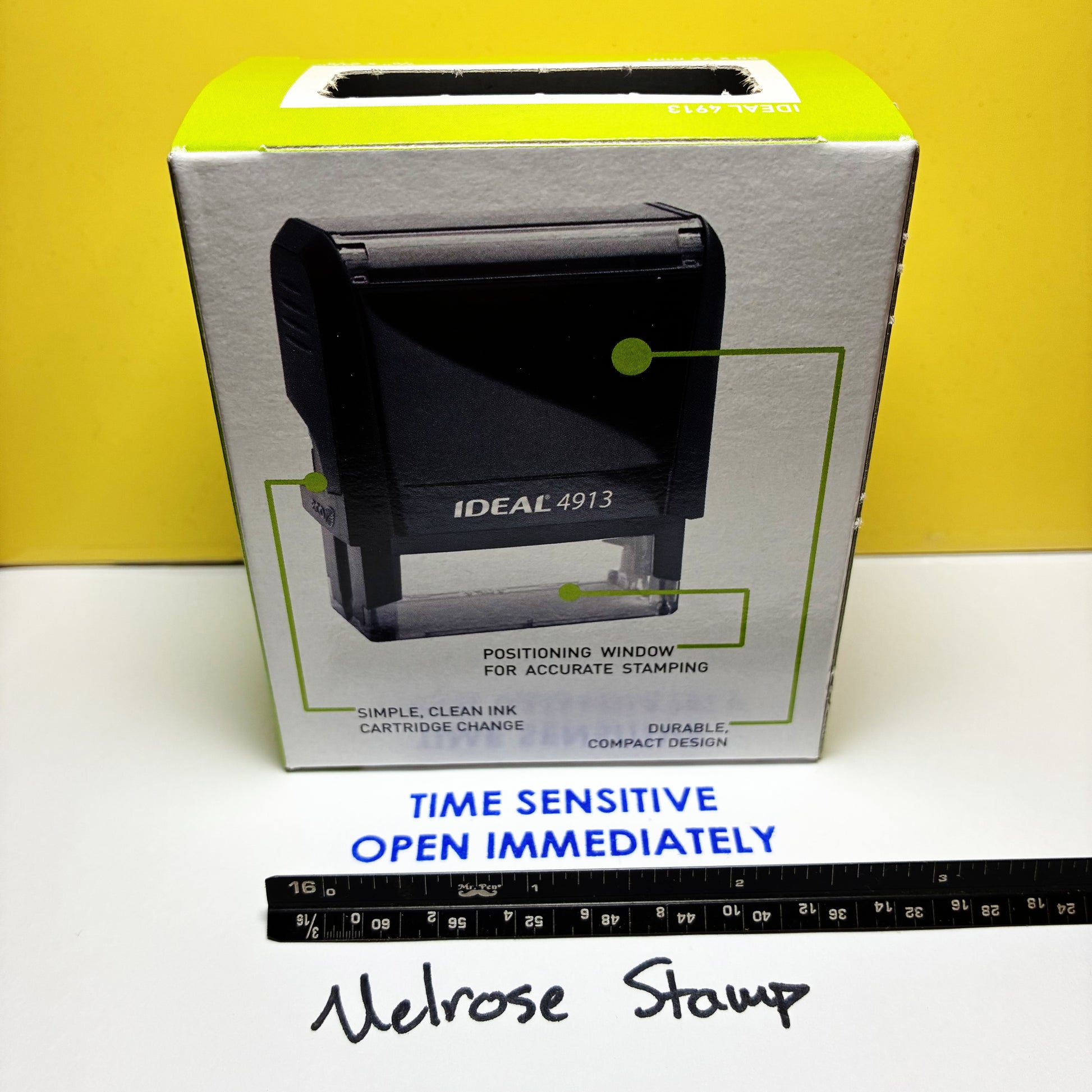 The Ideal 4913 Stamp Model has an Impression Area of: 2.38" length x .88" width/height (58 mm x 22 mm). Stamper can be re-inked for thousands of impressions. Don’t settle for smaller stamps!